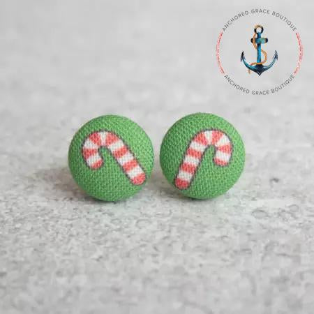 Candy Canes Fabric Button Earrings